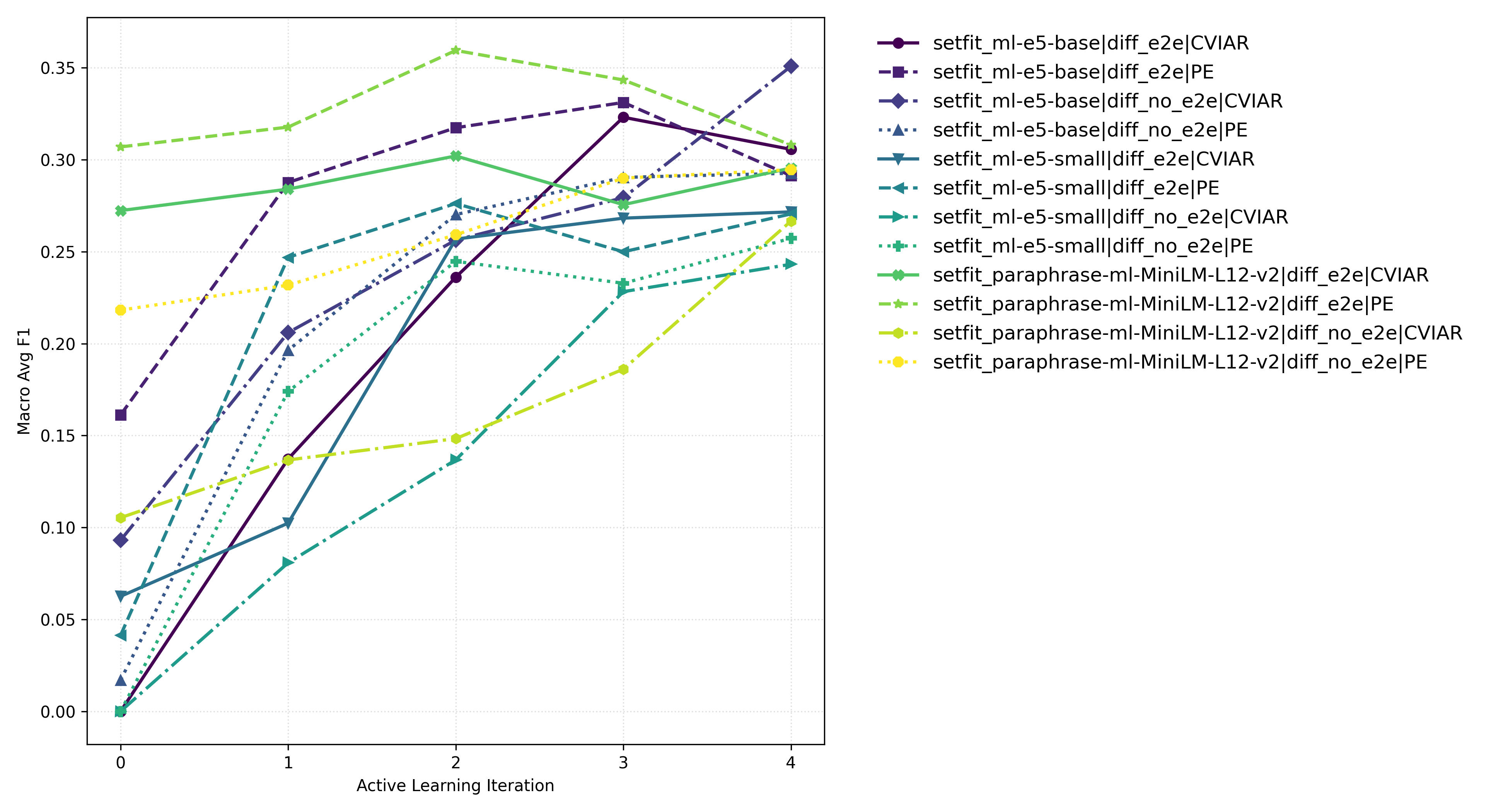 For each configuration, we simulated an active learning run by initializing the model with 20 labeled examples, followed by five iterations in which 25 additional examples were annotated. This resulted in 145 labeled samples per run. The total labeled data pool contained 210 examples, with each configuration selecting different subsets depending on model and query strategy.