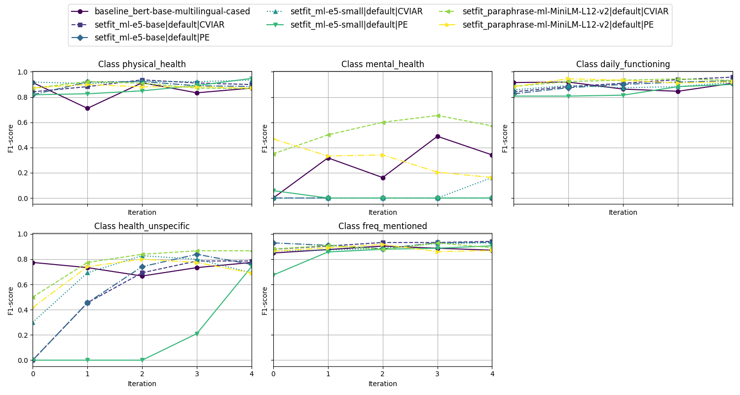 Class-wise performance provides additional insight (Figure 3). In particular, the categories “Mental Health” and “Unspecific” are difficult for the models to predict and strongly influence overall performance. This is also the reason why the baseline model ranks higher than other SetFit configurations, since it achieves higher scores for the harder-to-predict classes, but its performance for the other classes is overall still worse. The unequal class performance may indicate that some categories are too broadly defined or inconsistently annotated. Despite this, overall F1 scores are relatively high, which is encouraging given the complexity of the task.