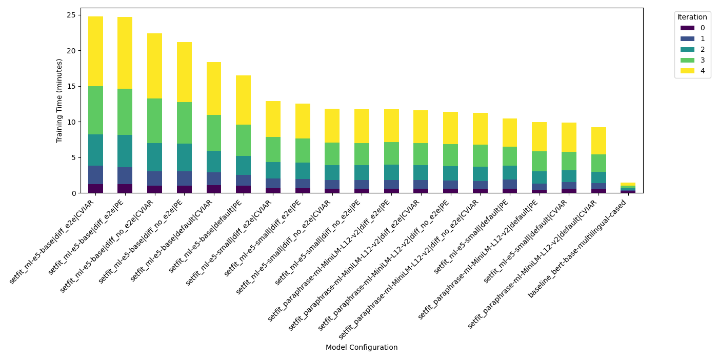 Training time is a crucial practical factor in active learning, as long delays between iterations disrupt the annotation workflow. As shown in Figure 4, training time largely scales with the number of model parameters. The configuration with the 0.3B e5-base model required the longest training time. In the SetFit framework, training time increases non-linearly because the number of contrastive training pairs grows quadratically with the number of training examples.
