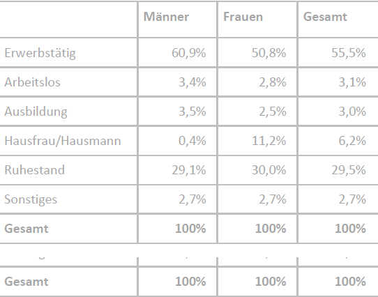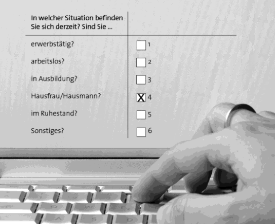 - Die Daten der Erhebung werden ohne Namen und Kontaktdaten ausgewertet. Der Computer zählt z. B. alle Antworten zur Gesundheit und errechnet daraus Prozentergebnisse. Das Gesamtergebnis und die Ergebnisse für Teilgruppen (z.B. Männer, Frauen) werden in Tabellenform ausgedruckt (siehe Beispiel). Angaben einzelner Personen sind nicht erkennbar.